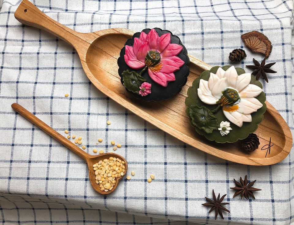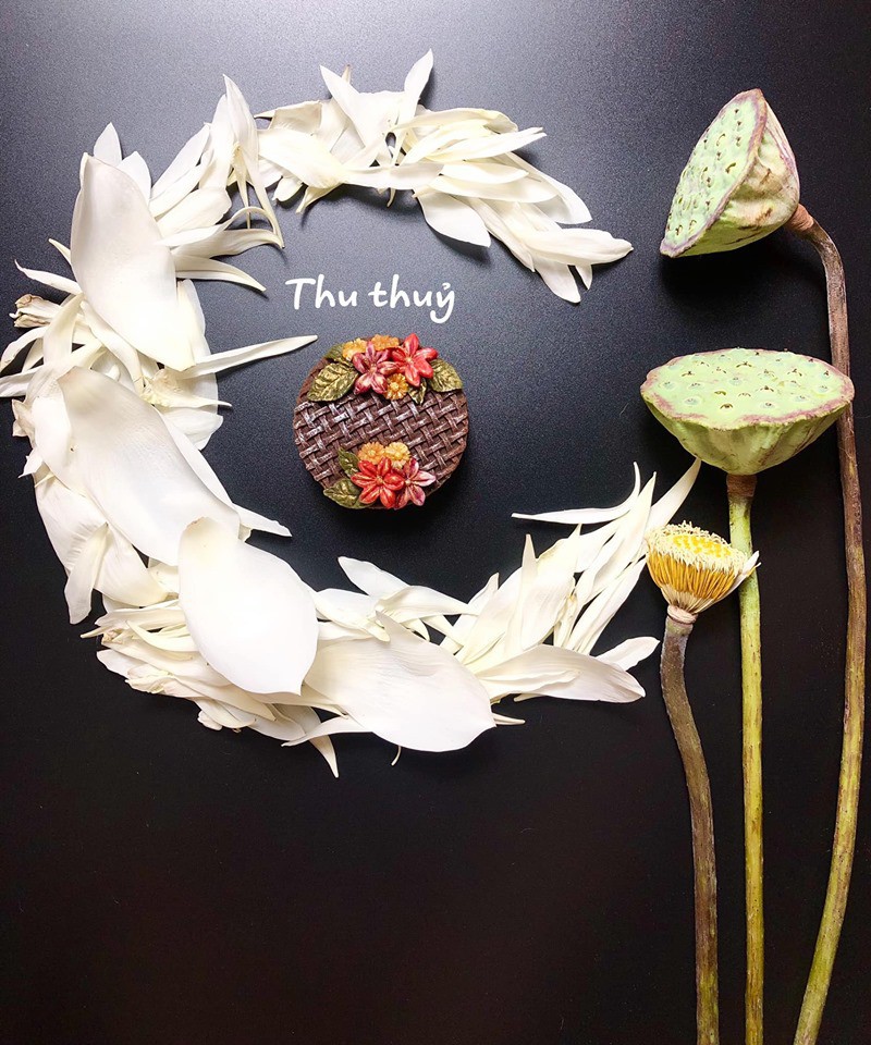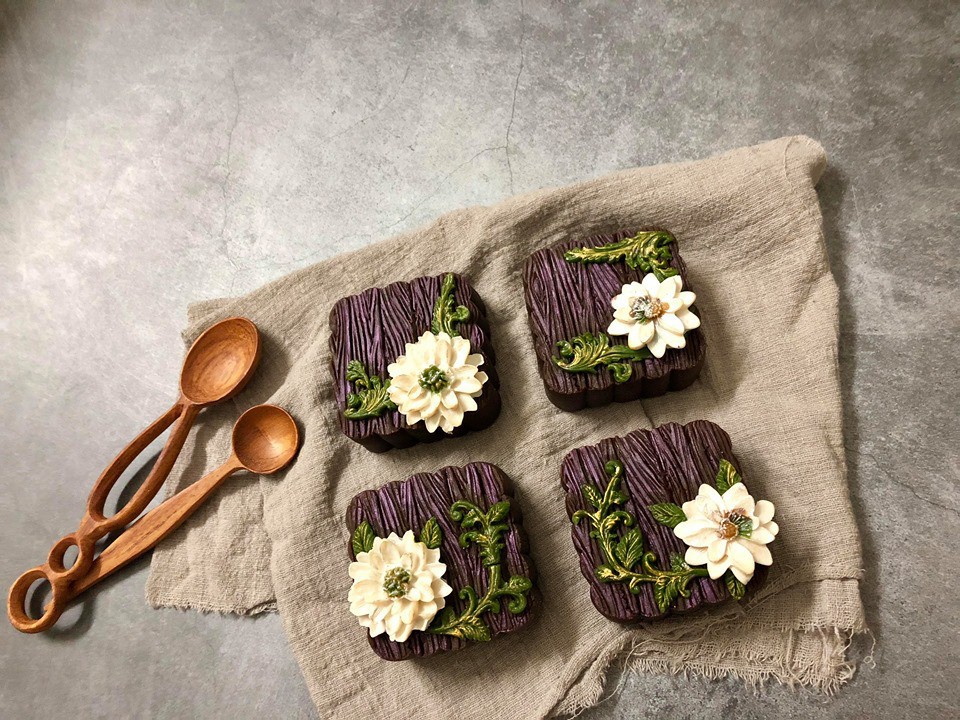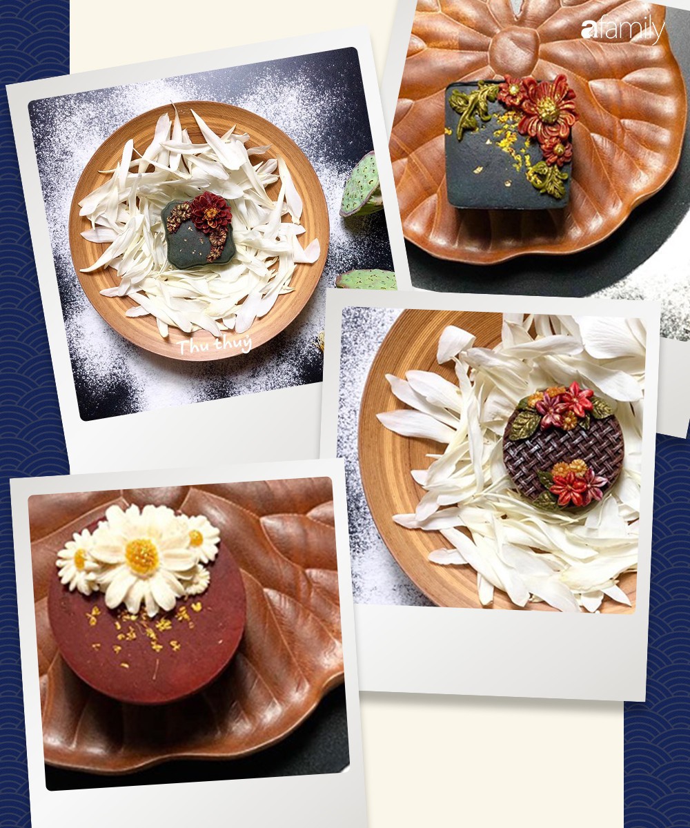 Bánh không có khác biệt lớn về nhân hay vỏ, nhưng cực kì trau chuốt ở khâu tạo hình trên mặt bánh. Những cánh hoa, chiếc lá làm từ đường fondant hoặc bột màu được gắn lên và bày trí sinh động, khiến hộp bánh giở ra như một bức tranh đầy màu sắc.